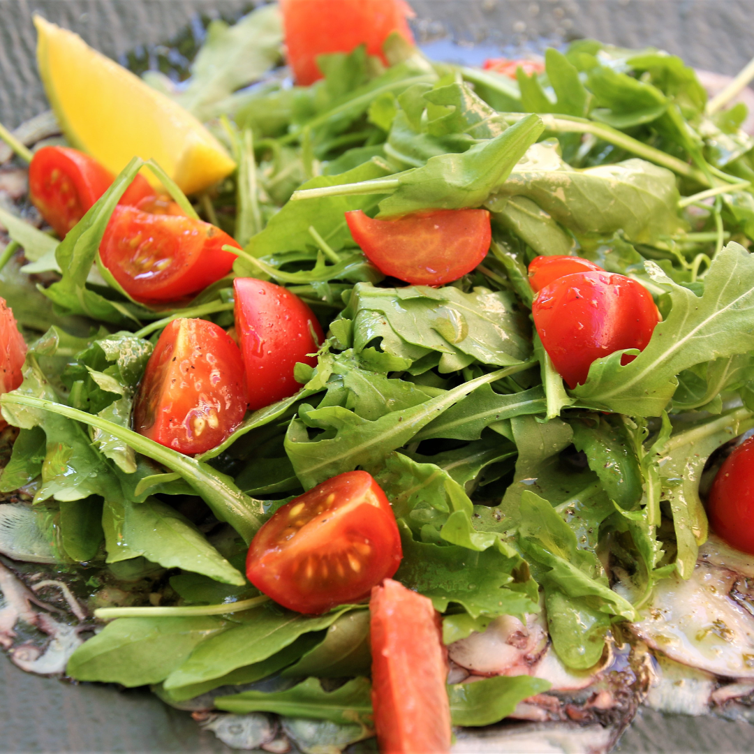 Tomate, mozzarella, gésiers, mortadelle, poivrons, salade